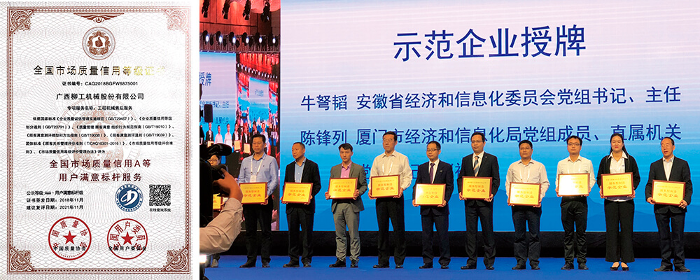柳工股份公司獲“3A級用戶滿意標桿服務”證書