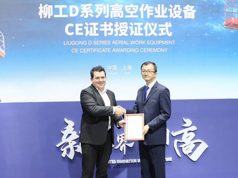 展會現場安徽柳工起重機有限公司營銷公司總經理王鵬飛先生與四家公司分別簽署了戰略合作協議和共計人民幣5000萬元的授信協議。合作伙伴對柳工產品的認可是支持柳工前進的最大動力,也是柳工發展道路上的永恒目標。在D系列高空作業設備產品發布會上,TUV SUD 大中華區工業服務部總監Mr. Simon Lemin向安徽柳工高空作業設備分公司總經理劉國強頒發CE認證,標示著安徽柳工高空作業設備獲得了歐盟公告機構的認可,為柳工高空作業設備進入歐洲市場邁出堅實的一步,柳工也將借此更好地服務全球高空客戶。