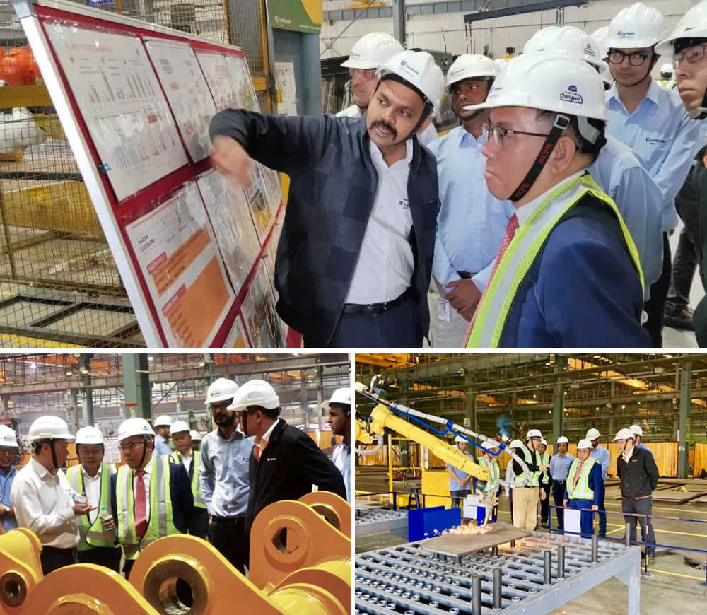 在實(shí)地視察工廠生產(chǎn)情況時(shí),他仔細(xì)檢查了挖掘機(jī)結(jié)構(gòu)件的制造過程。看到行走架焊縫、斗桿焊接及鏟斗焊接質(zhì)量較之去年有了很大的提升,他對此十分高興。同時(shí),認(rèn)真聽取了今年新增加的切割坡口、挖掘機(jī)斗桿焊接、行走架焊接三臺機(jī)器人質(zhì)量、產(chǎn)能改善情況的介紹,并參與了行走架焊接機(jī)器人啟用儀式和印度柳工第一屆焊接技能比賽的頒獎儀式。