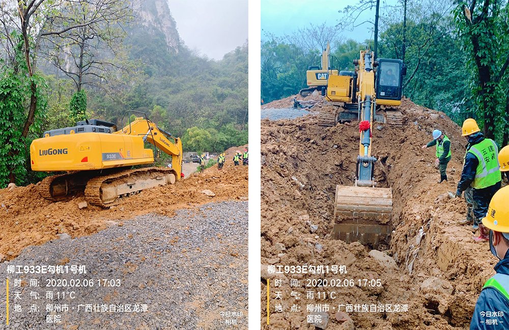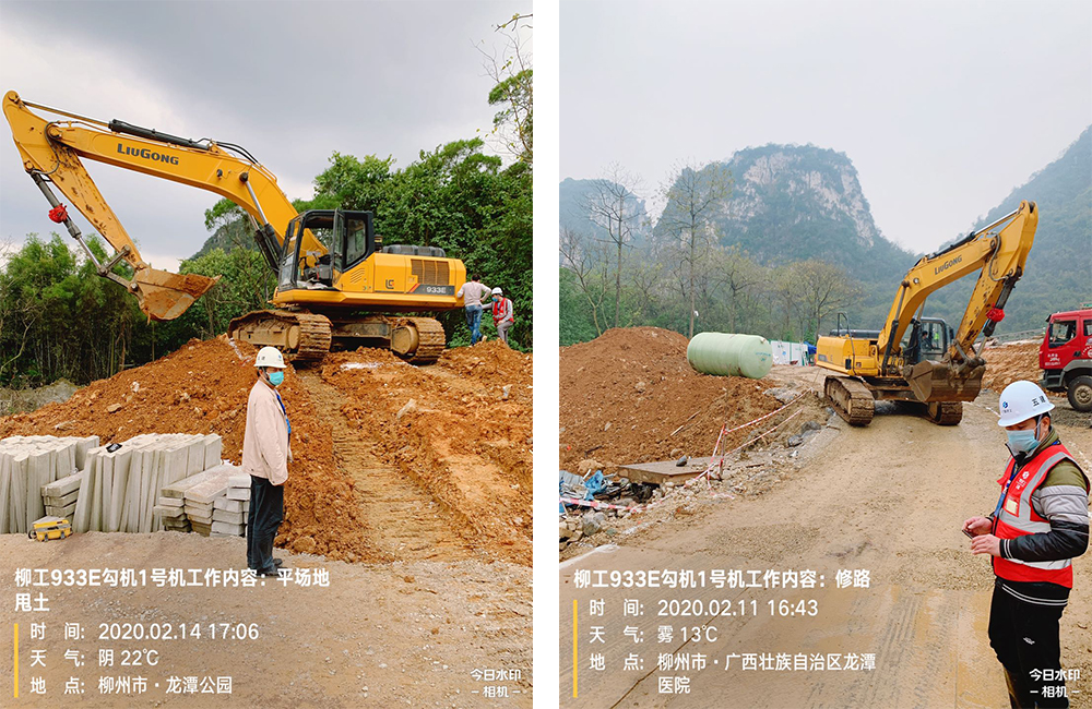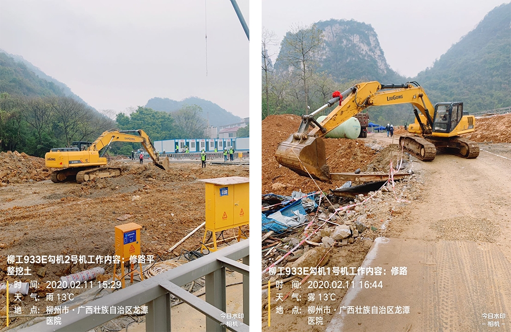 該項目2月9號正式開工,2月23號竣工,2月24號移交,2月25號正式啟用。前期場地平整從2月3號就開始了,柳工多臺933E挖掘機設備在此期間也參與到了柳州“全負壓病房”的建設中來,在建設現場,柳工設備參與了場地的平整、道路修整等工作。
