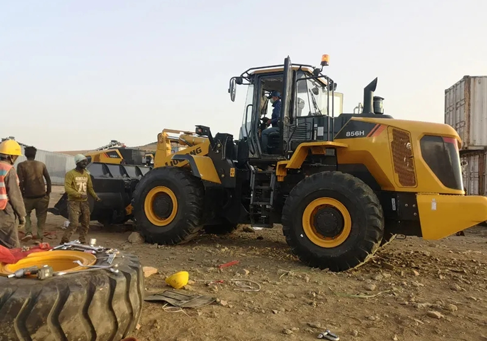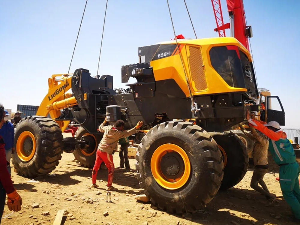 2020年3月26日,柳工7臺856H裝載機順利抵達埃塞俄比亞迪巴克地區的客戶項目部現場,第二天,客戶就要求7臺設備急需快速組裝。