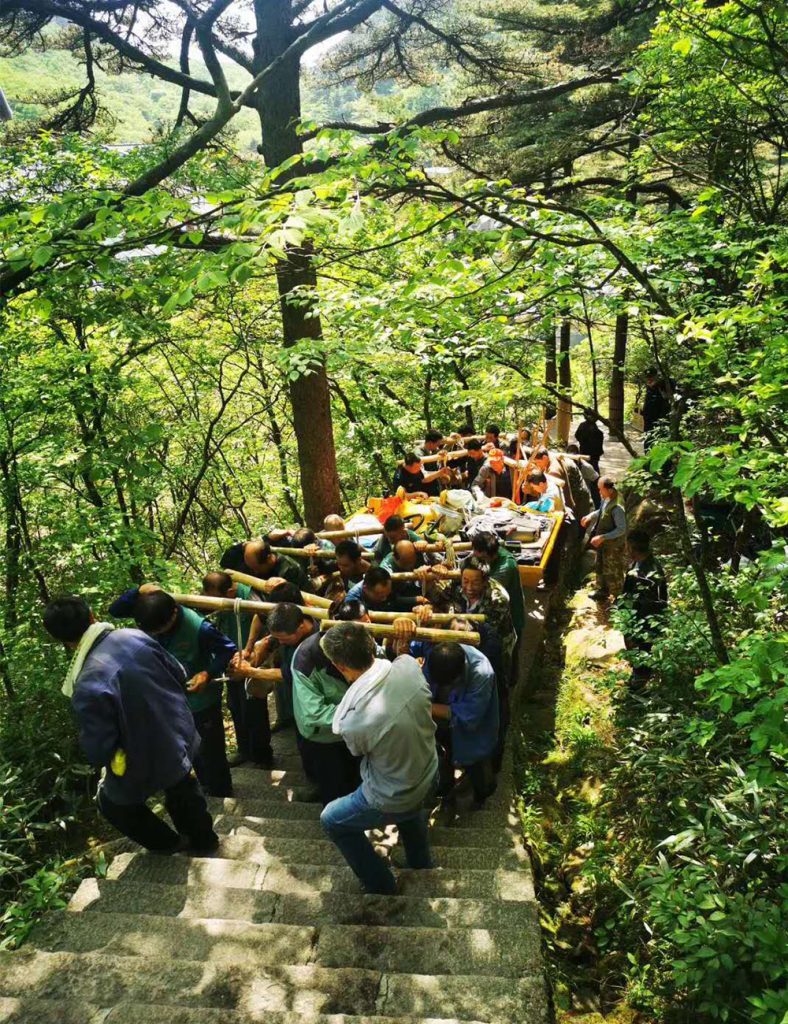 5月18日,全部散裝件以手抬肩扛的形式,被逐一運送至山頂;