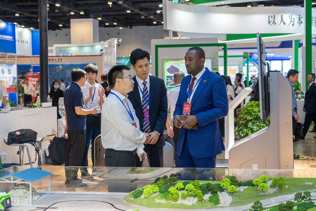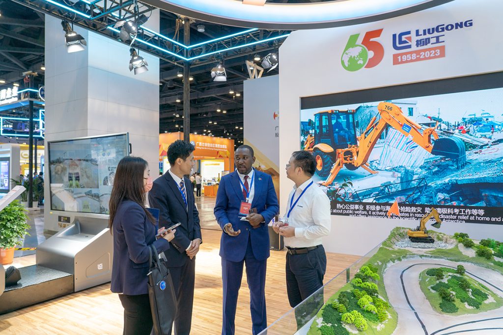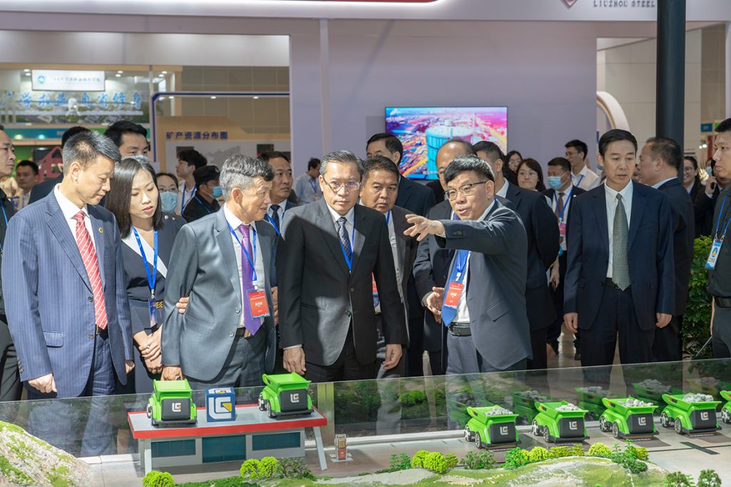 開幕式后,中外嘉賓共同參觀了柳工展臺,現場了解柳工智慧礦山系統模擬演示、柳工5G智能遙控裝載機等智能、綠色礦山解決方案。