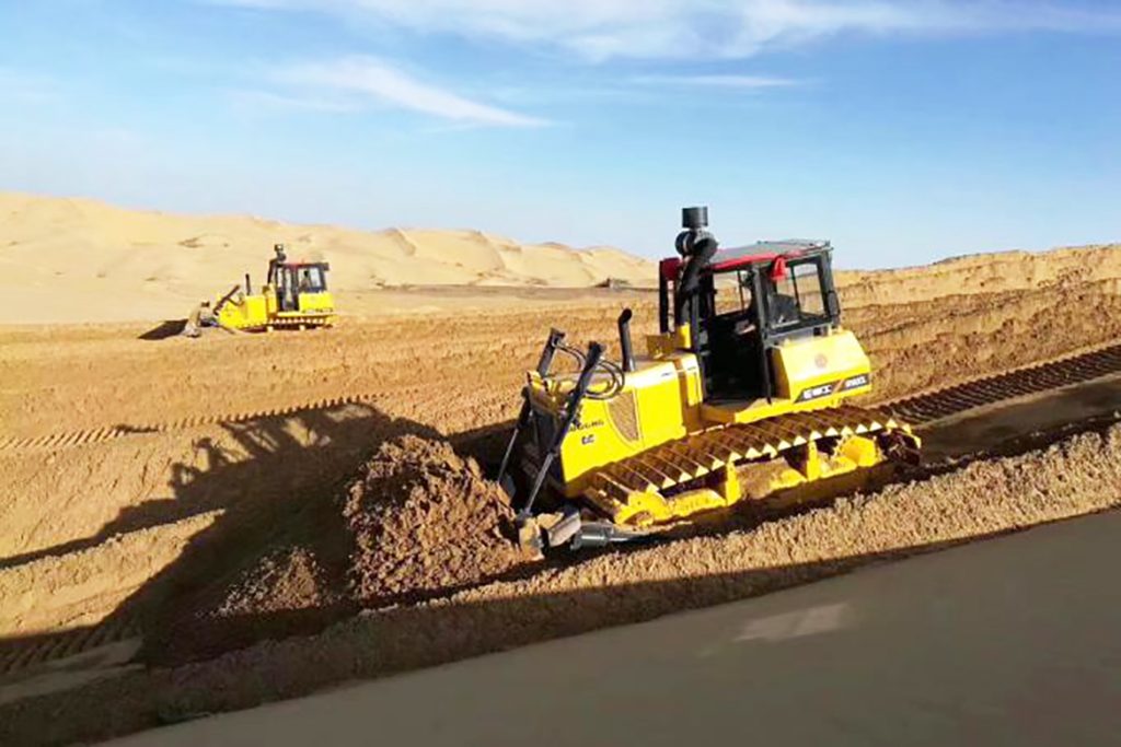 項目初期,共有16臺柳工B160CL濕地型、液力型、機械型特殊配置推土機參與庫布齊基地建設,因光伏項目階段性工期時間緊、任務重,柳工再度投入15臺B160CL推土機參與該項目沙漠場地的平整作業。