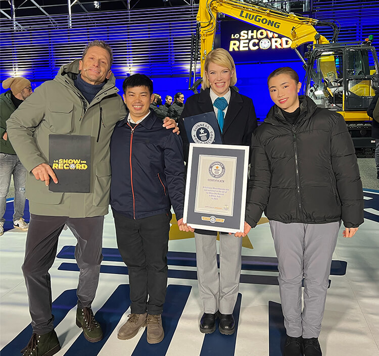 近日,在意大利電視臺(tái)《Lo Show dei Record》節(jié)目中,朱飛操控柳工915FCR挖掘機(jī),成功在1分鐘摘掉模特頭上的15頂帽子,打破了該項(xiàng)目此前1分鐘摘下11頂帽子的吉尼斯世界紀(jì)錄